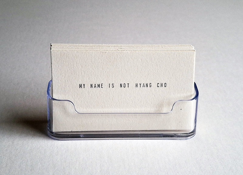my name is not hyang cho on-going giveaway project, ink stamp on paper Hand-out business card that says ‘my name is not hyang cho’ << >>