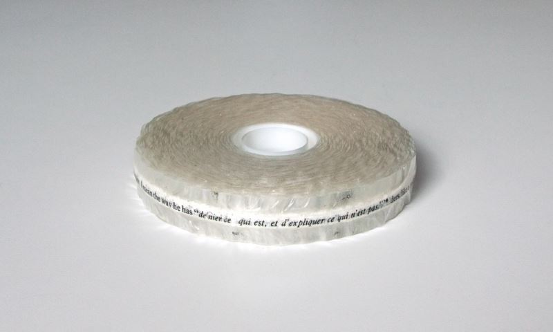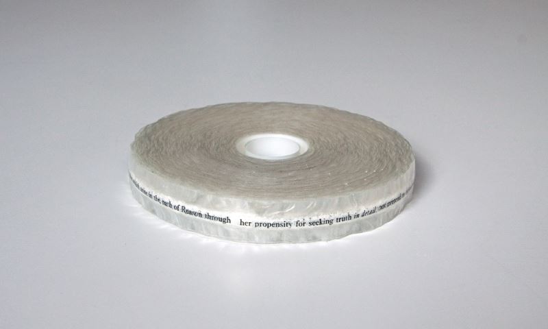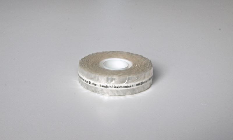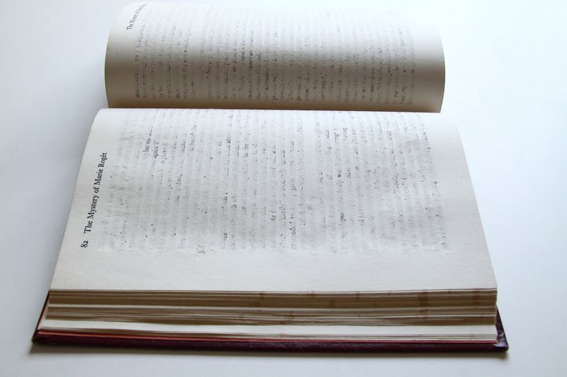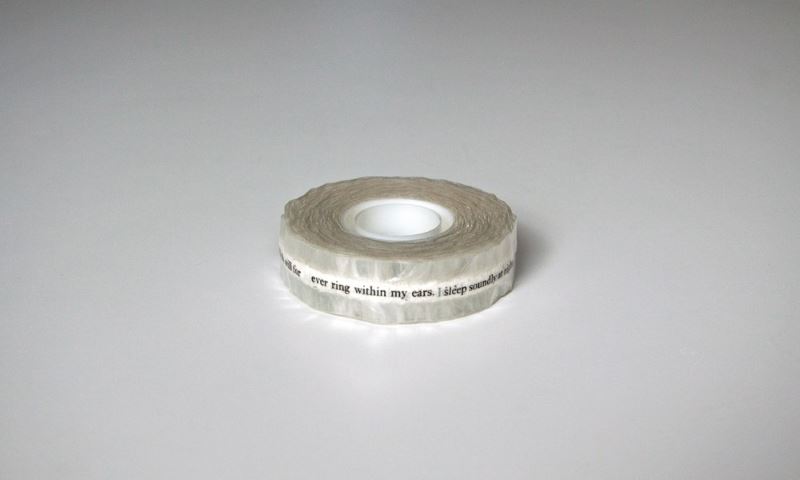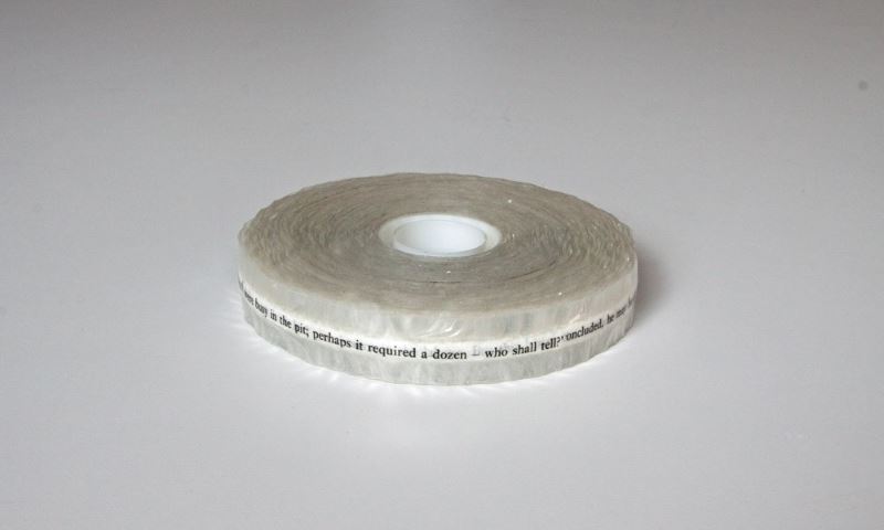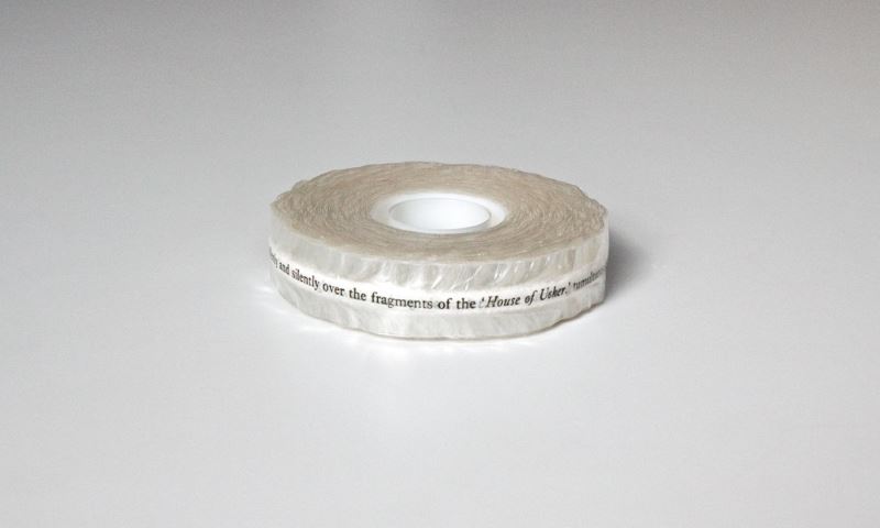 Six Tales of Mystery and Imagination consists of six roles of tapes and the book. All the sentences of each story were peeled off from the book with the rolls of transparent tape and rolled back from the first sentence to the last sentence. As a result, six stories are locked in between space of the six rolled transparent tapes and the book becomes empty with the trace of the stories remaining.