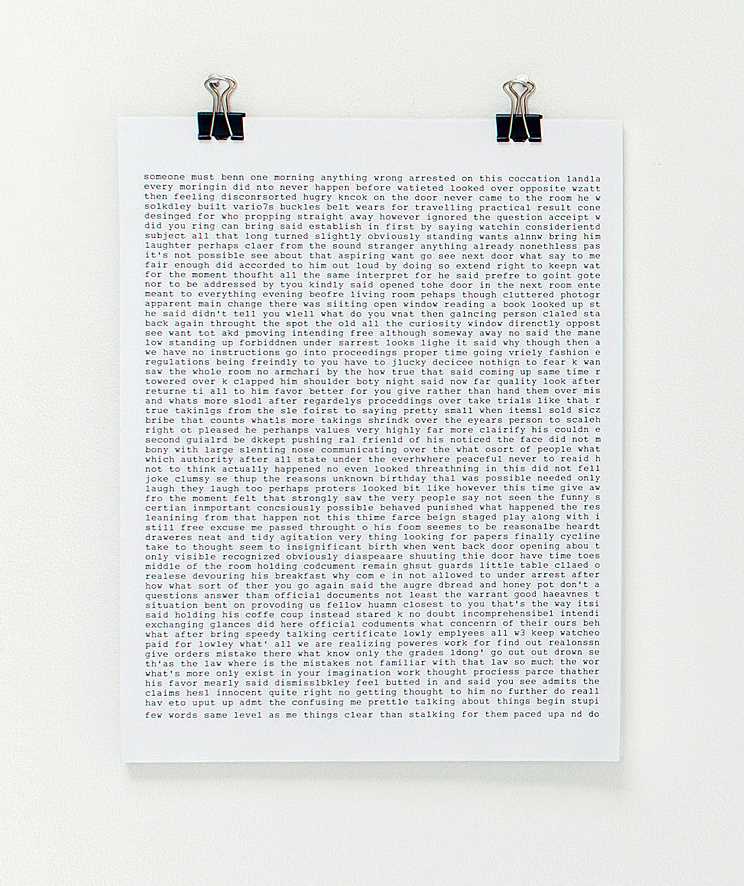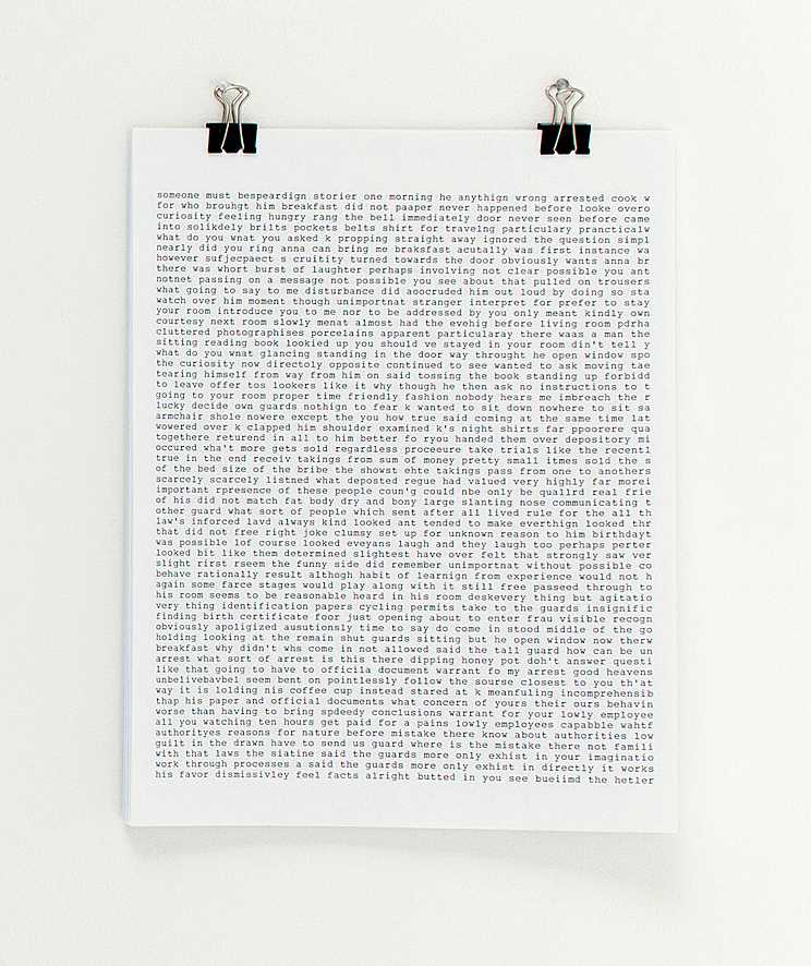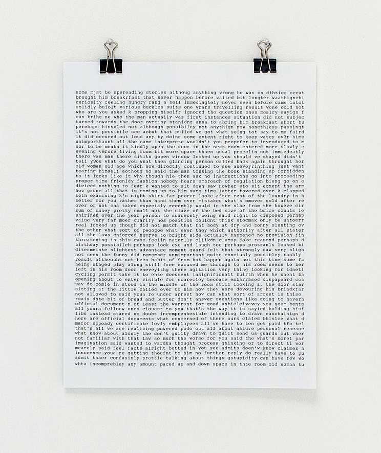 Trial 3 is a series of transcription of the audio book of “The Trial” by Franz Kafka, made on an electronic typewriter. The speed of my typing is unable to keep up with the speed of the reading in the audio book. Therefore, the letters and words are missing and the sentences are broken.